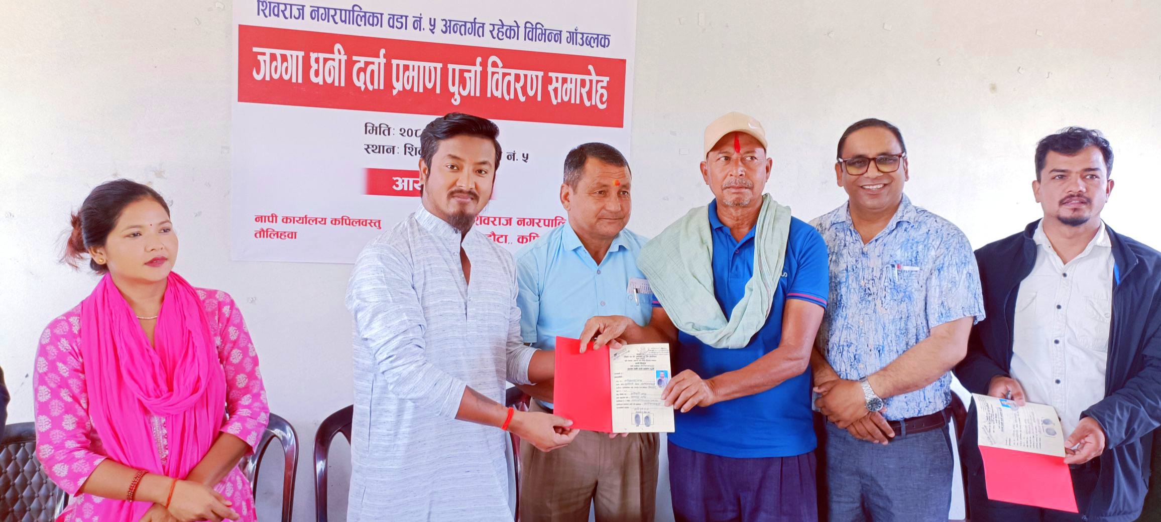 ललपुर्जा वितरण गर्दै नगर उपप्रमुख शिवकुमारी थारुले वषा पहिले शिवराजको २ नम्बर विभिन्न गाउका नागरिकलाइ लालपुर्जा वितरण गरेको भन्दै अव अन्य बाकिं गाउँमा वितरण गर्ने बताउनु भयो । उहाँले नापजाँच छुटेका गाउँहरूमा समन्वय गरेर प्रक्रिया अगाडि बढाइने उल्लेख गर्नुभयो।