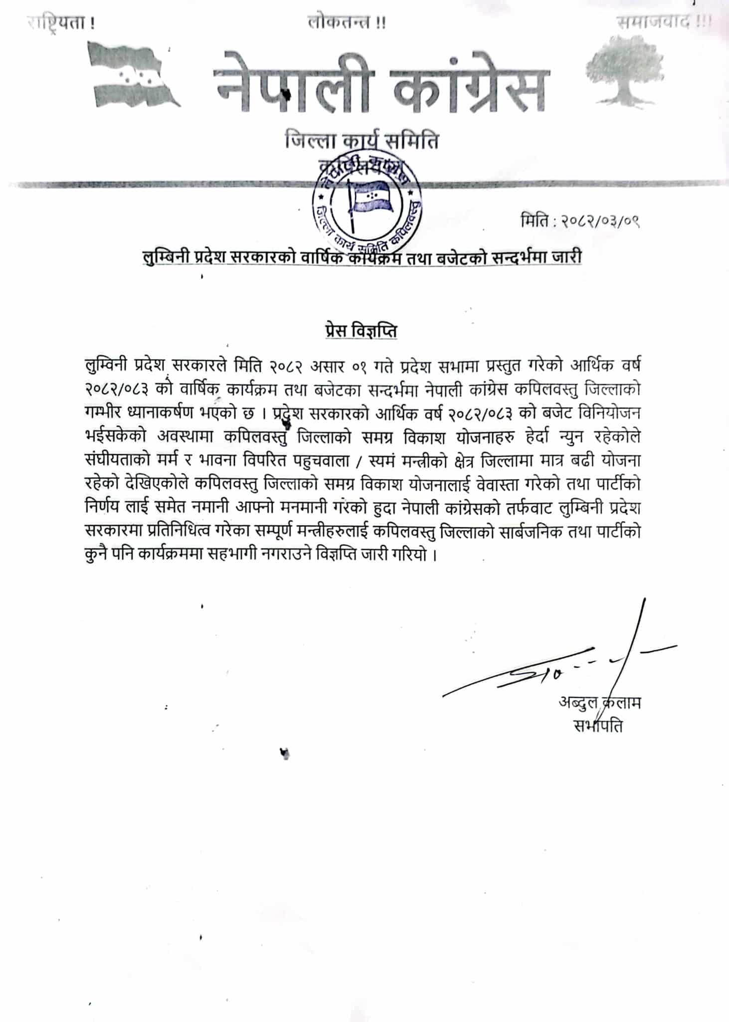 लुम्बिनी प्रदेश सरकारले आगामी आर्थिक वर्ष २०८२/०८३ का लागि सार्वजनिक गरेको वार्षिक कार्यक्रम तथा बजेटप्रति नेपाली कांग्रेस कपिलवस्तु जिल्ला समितिले कडा आपत्ति जनाएको छ।