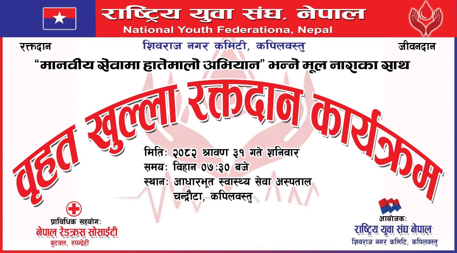 शिवराज, कपिलवस्तु — राष्ट्रिय युवा संघ नेपाल शिवराज नगर कमिटीको आयोजनामा श्रावण ३१ गते शनिवार वृहत् खुल्ला रक्तदान कार्यक्रम हुने भएको छ। कार्यक्रम शिवराज–५ चन्द्रौटास्थित आधारभूत स्वास्थ्य सेवा अस्पतालमा हुने नगर अध्यक्ष नारायण सापकोटाले जानकारी दिनुभयो।