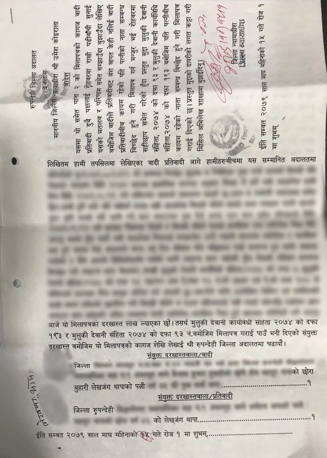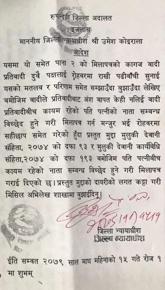 डा. थापाले २०७९ माघ १५ गते जिल्ला अदालत रुपन्देहीमा न्यायाधीश उमेश कोइरालाको इजलाशमा सम्बन्ध विच्छेद गरी मिलापत्र गरेको कागज सार्वजनिक गरेका हुन् ।